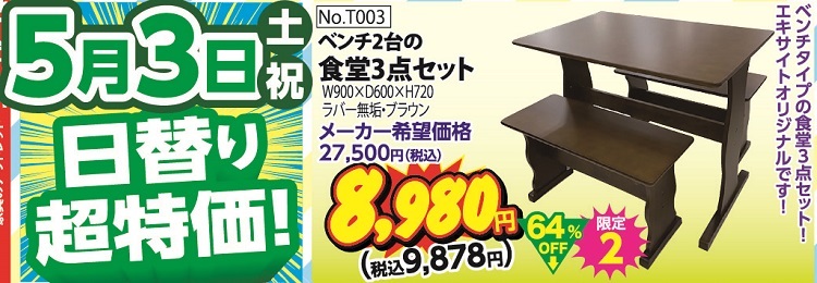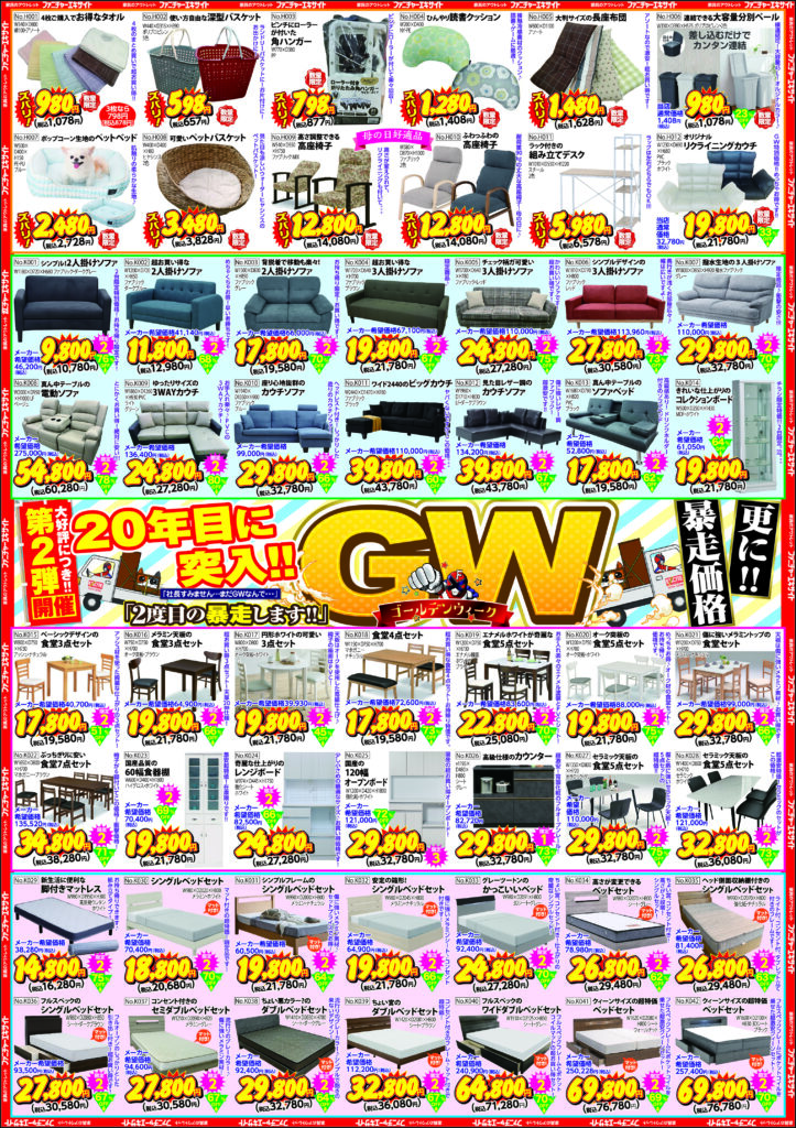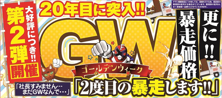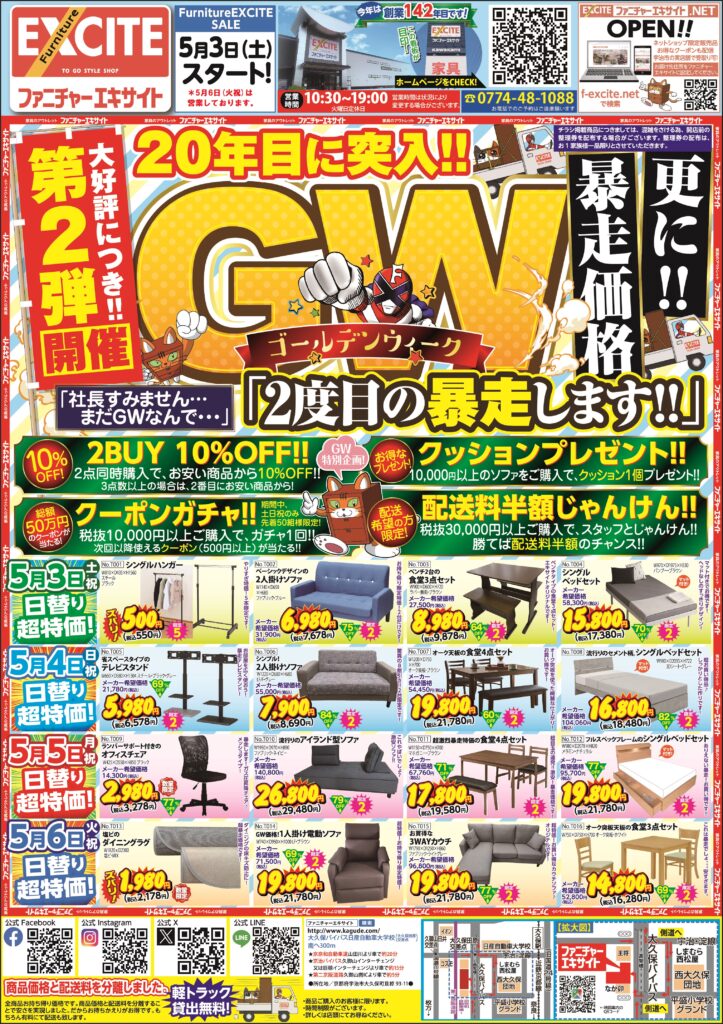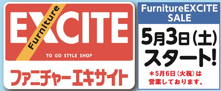 2025.04.30 ファニチャーエキサイト!20年目に突入!GW(ゴールデンウィーク)セール!第2弾!(2025年5月3日(土)あさ10時30分スタート!) 2025年5月3日(土)スタート! 10:30~19:00 ネットショップはこちらをタップ ↓ ↓ ↓