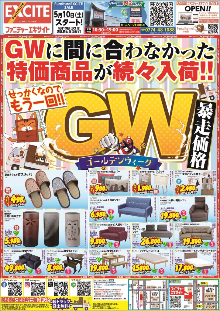 2025.05.07 ファニチャーエキサイト!せっかくなのでもう1回!GW(ゴールデンウィーク)セール!(2025年5月10日(土)あさ10時30分スタート!) 2025年5月10日(土)スタート! 10:30~19:00 ネットショップはこちらをタップ ↓ ↓ ↓