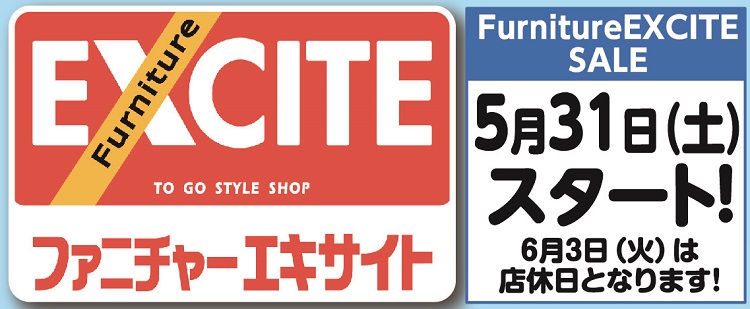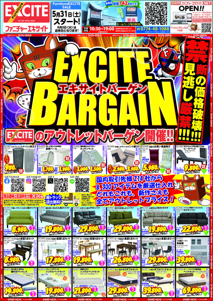2025.05.30 ファニチャーエキサイト!禁断の価格破壊!EXCITE BARGAIN(エキサイトバーゲン)見逃し厳禁!(2025年5月31日(土)あさ10時30分スタート!) 2025年5月31日(土)スタート! 10:30~19:00 ネットショップはこちらをタップ ↓ ↓ ↓
