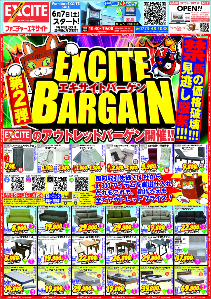 ファニチャーエキサイト!禁断の価格破壊!EXCITE BARGAIN(エキサイトバーゲン)見逃し厳禁!第2弾!(2025年6月7日(土)あさ10時30分スタート!)