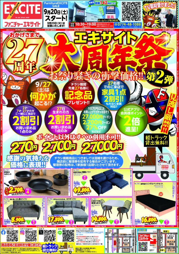 2025.09.17 ファニチャーエキサイト!おかげさまで27周年!エキサイト大周年祭!第2弾!(2025年9月20日(土)あさ10時30分スタート!) 2025年9月20日(土)スタート! 10:30~19:00 ネットショップはこちらをタップ ↓ ↓ ↓