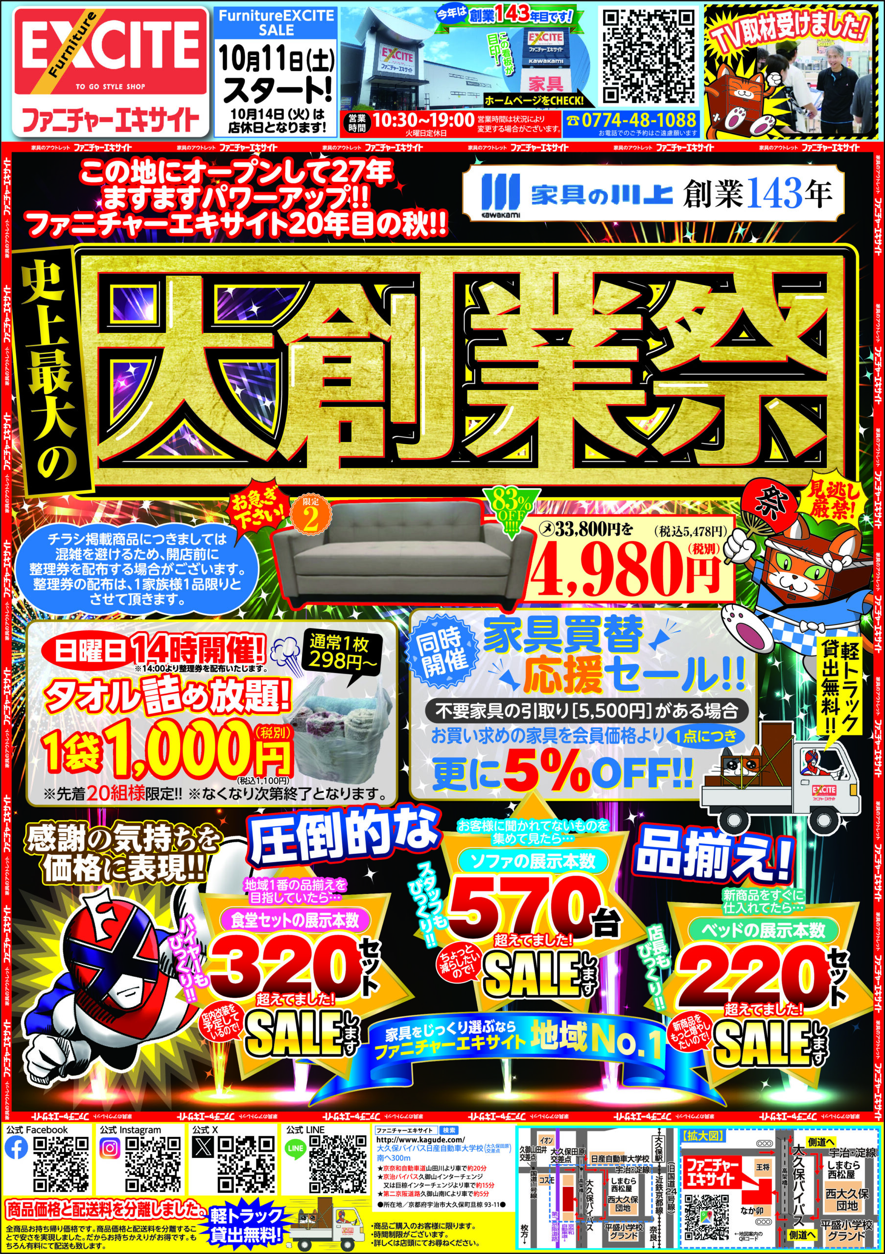 2025.10.09 ファニチャーエキサイト!創業143年!史上最大の大創業祭!(2025年10月11日(土)あさ10時30分スタート!) 2025年10月11日(土)スタート! 10:30~19:00 ネットショップはこちらをタップ ↓ ↓ ↓