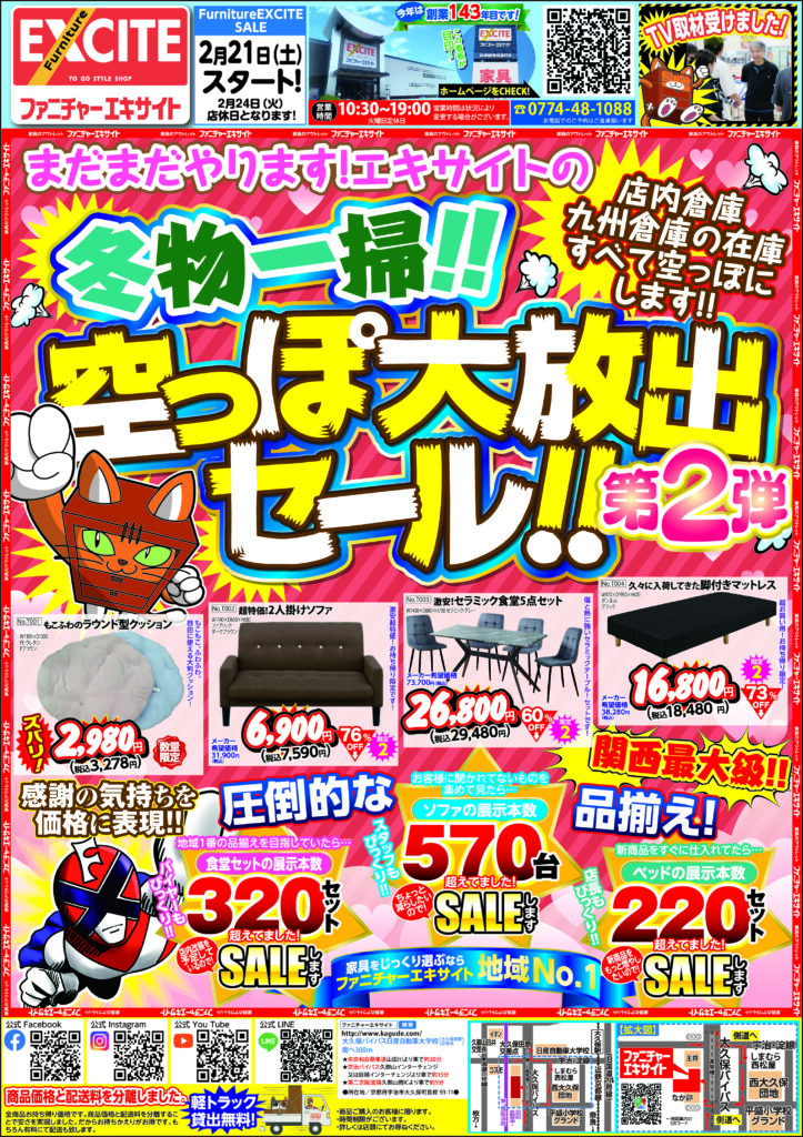 ファニチャーエキサイト!冬物一掃!空っぽ大放出セール!第2弾!(2026年2月21日(土)あさ10時30分スタート!)