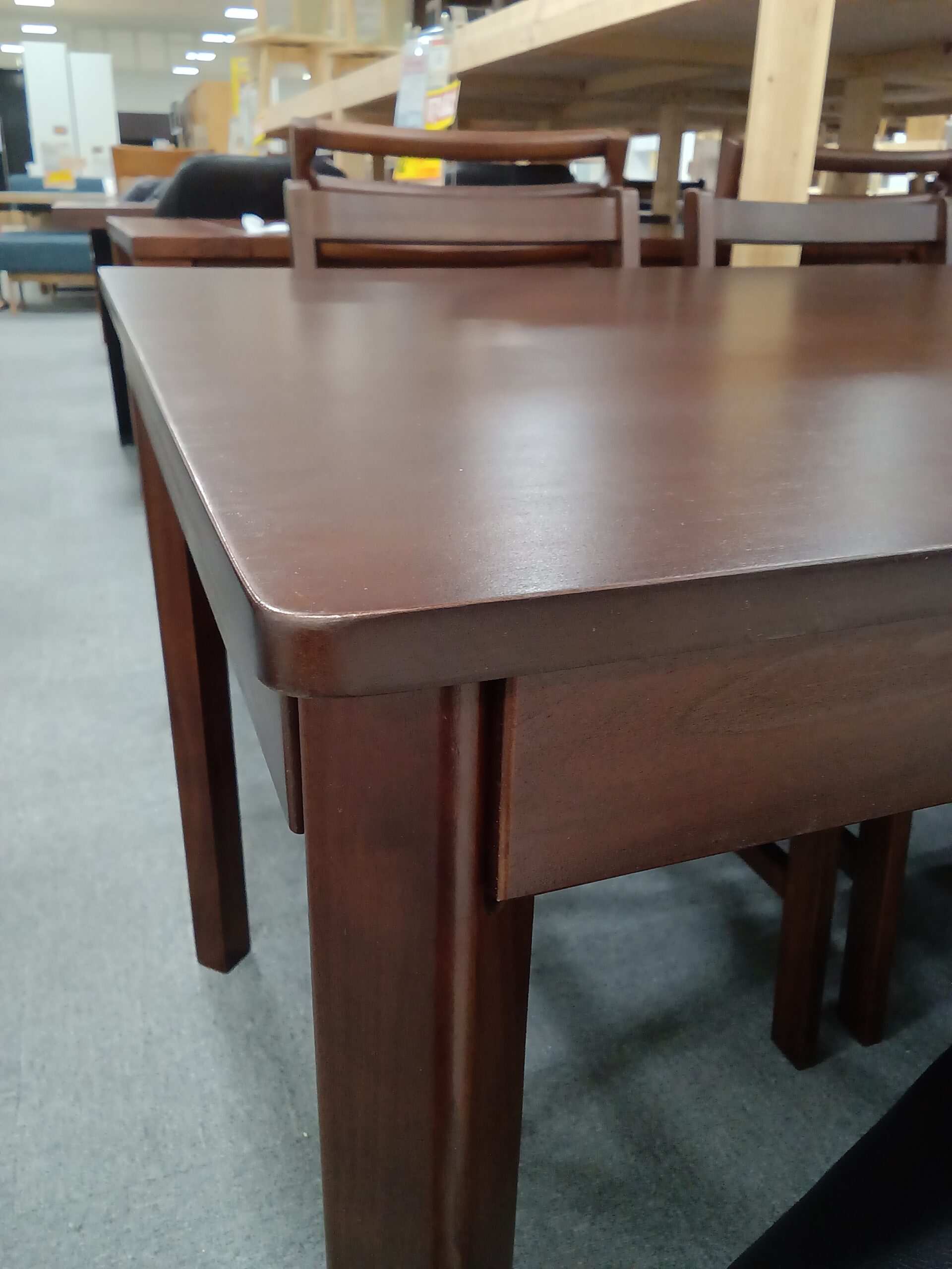 天板は高級で有名なマホガニー材、椅子はラバーの無垢材、シートは