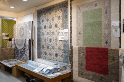 シンプルな無地のラグからヨーロピアン調の柄モノラグやオーダーカーペットが選べるコーナーです。