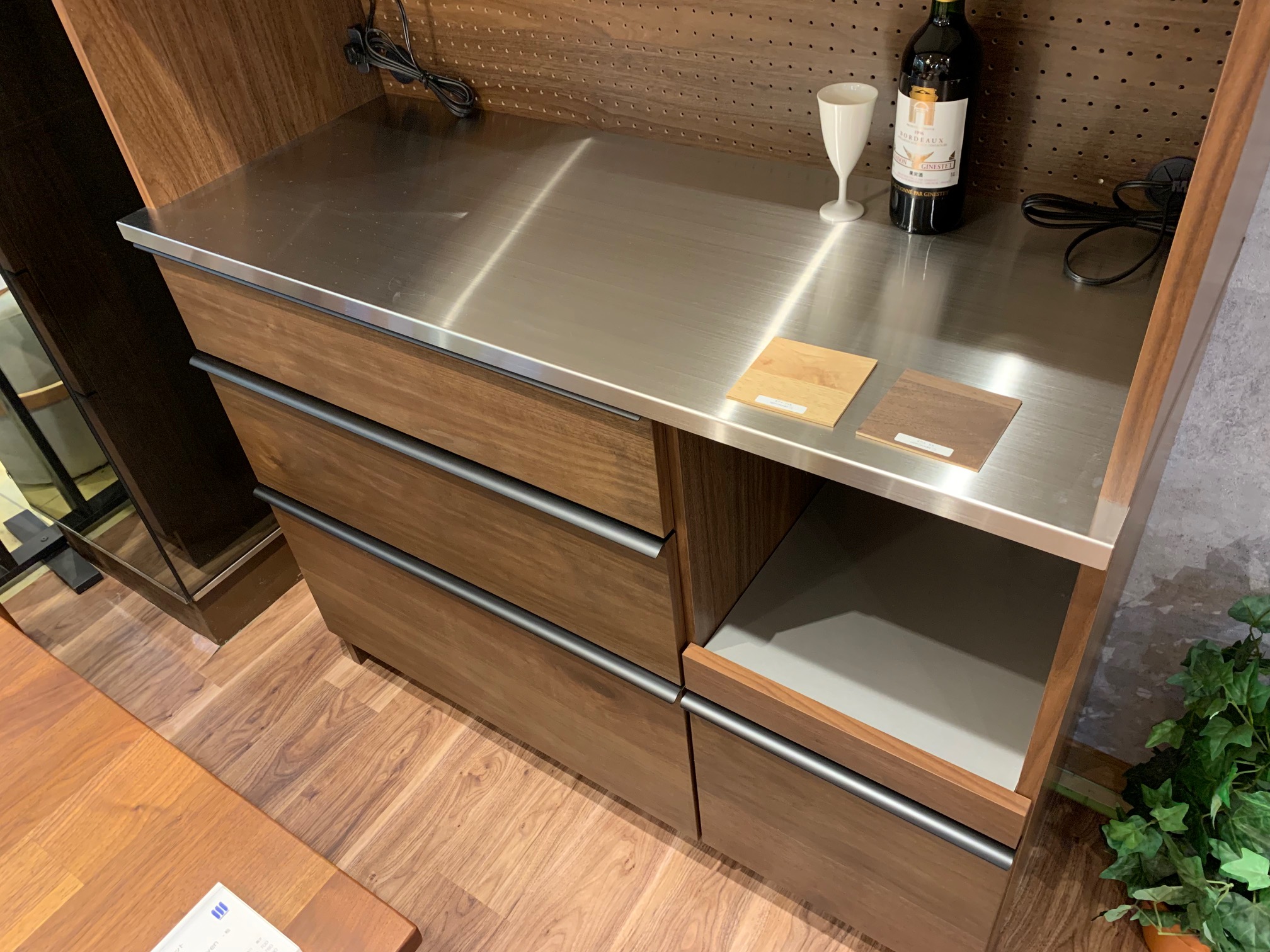 ステンレス天板と天然木(ウォールナット、オーク)のコントラストは