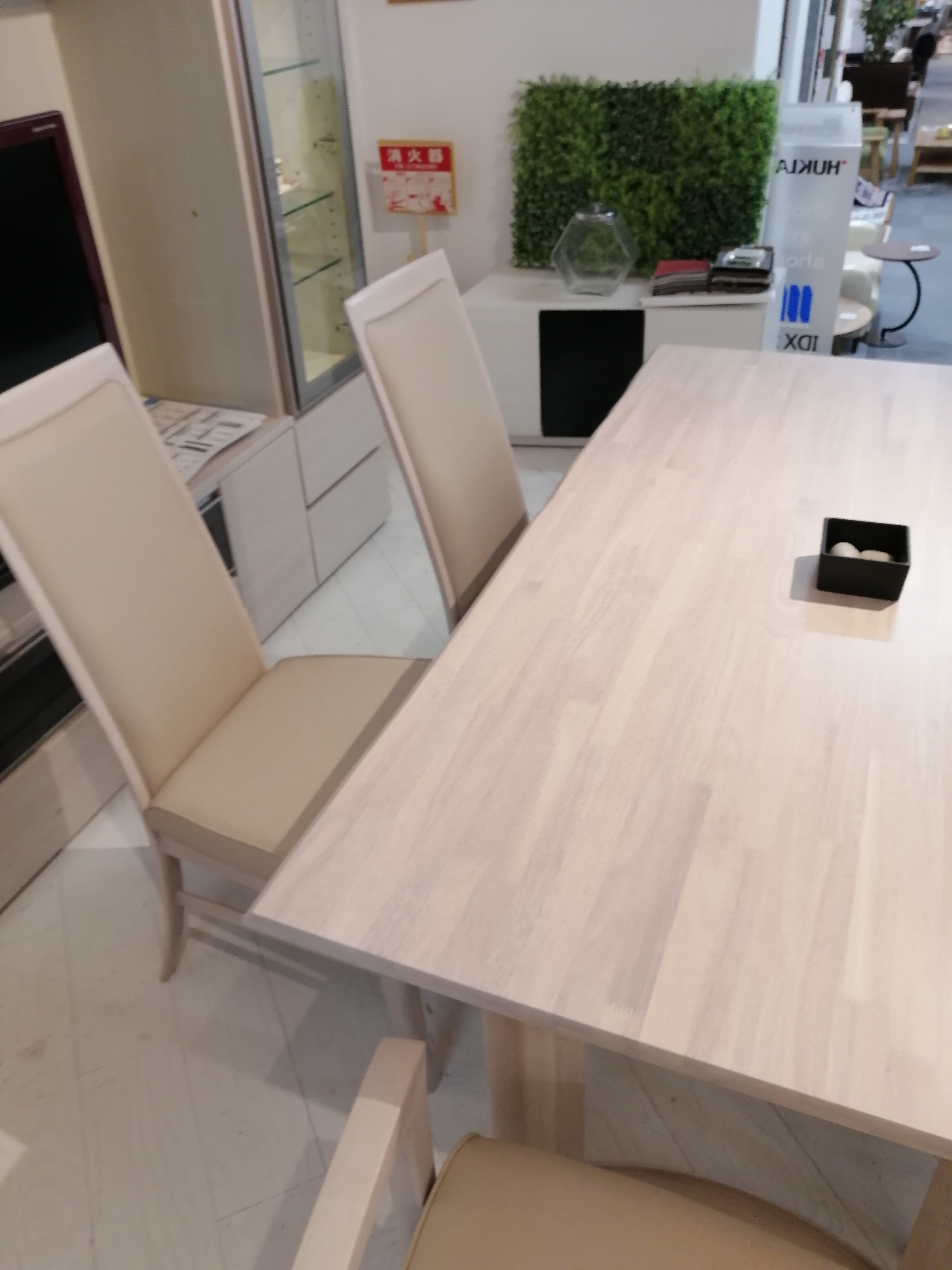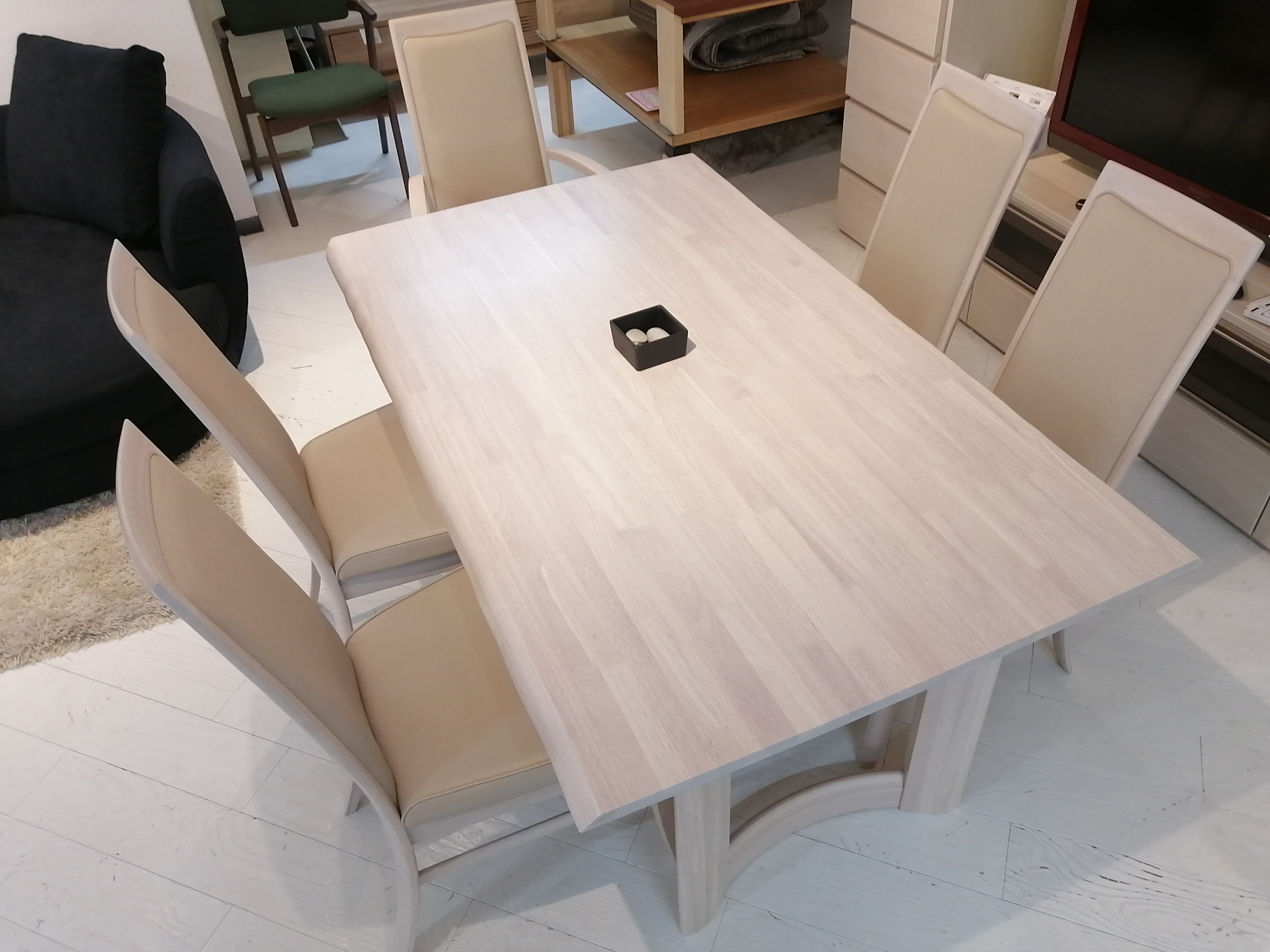 天然木ムク仕様のダイニングテーブル、ソフトな手触り感のスタイリッシュなチェアー。